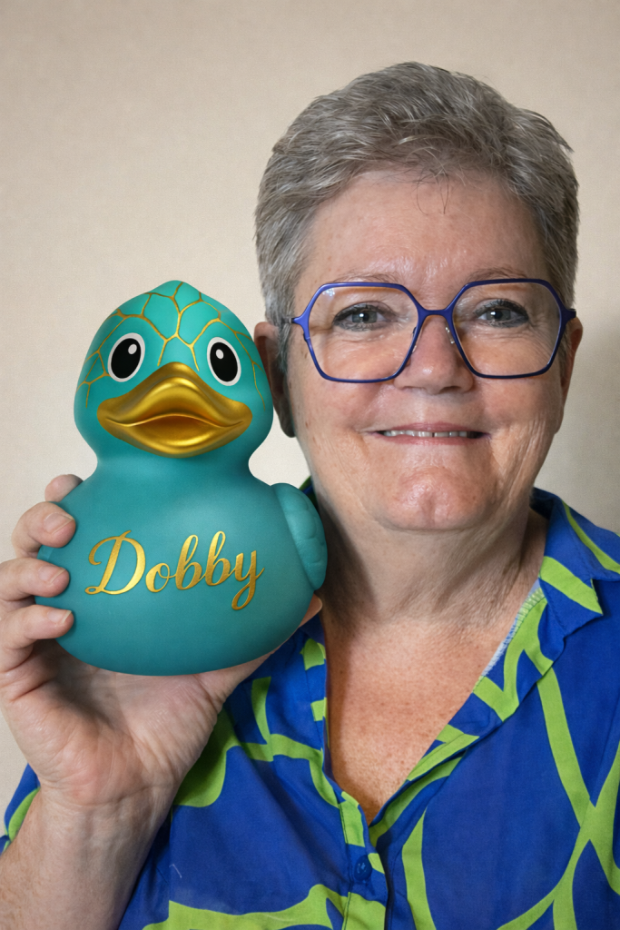 Terug in Nederland gaf ik dat gevoel vorm. Ik ontwierp Dobby: een turquoise eendje met gouden barstjes op zijn kopje. De gouden barstjes zijn geïnspireerd op kintsugi, de Japanse kunst waarbij breuken zichtbaar met goud worden hersteld. Niet om te verbergen wat er gebeurt, maar om te laten zien dat barstjes onderdeel van het verhaal mogen zijn. Dat iets beschadigd kan zijn en toch zijn waarde behoudt.