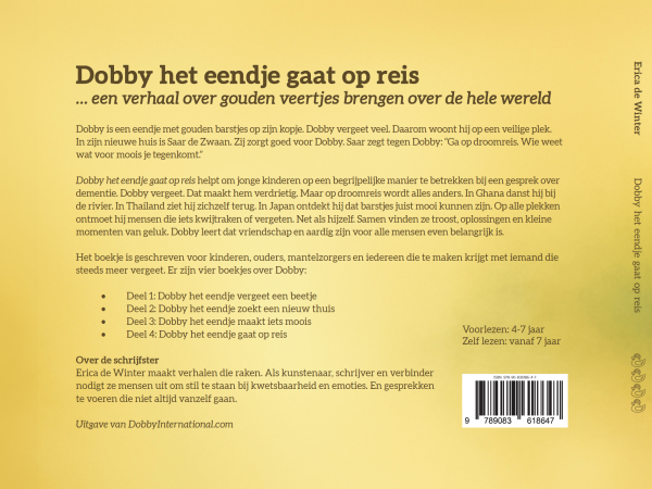Dit vierde boek is een kleurrijke droomreis over de wereld. Dobby reist met zijn gouden veertje langs verschillende landen, ontmoet nieuwe vrienden en ontdekt dat herinneringen overal verstopt zitten. Het boek is speels, avontuurlijk en tegelijk diep: het nodigt kinderen uit om vragen te stellen, verhalen te delen en te praten over vergeten en herinneren. Het is een prachtig slotstuk van de eerste Dobby-reeks en geeft alle ruimte om internationaal verder te bouwen met Dobby.