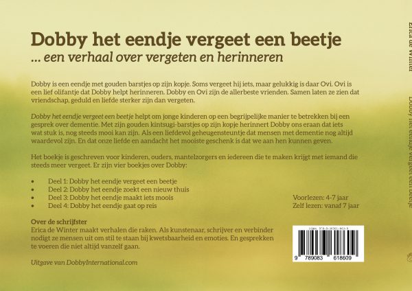 Dit is het eerste avontuur van Dobby. Een klein turquoise eendje met gouden barstjes dat soms merkt dat dingen onthouden lastiger wordt. In dit boek laat ik kinderen, en eigenlijk ook volwassenen, zien hoe het voelt als iemand met dementie verandert, maar nog steeds dezelfde liefdevolle persoon is. Het is warm, herkenbaar en toegankelijk, en vormt de zachte landing in de wereld van Dobby. Dit boek opent gesprekken en maakt iets moeilijks ineens bespreekbaar.