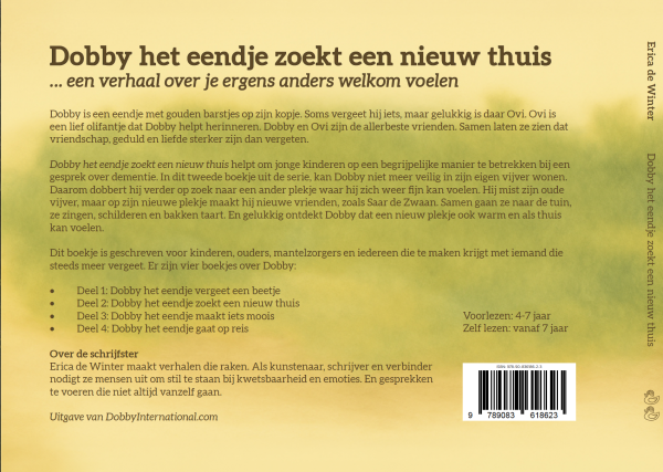 In dit tweede deel gaat Dobby op zoek naar een plek waar hij zich weer veilig en gezien voelt. Het raakt hier prachtig aan thema’s als thuiskomen, de weg kwijtraken en gevonden worden door lieve mensen. Voor kinderen is dit verhaal een troostende manier om te ontdekken dat verhuizen, veranderingen of zorgsituaties niet eng hoeven te zijn. Voor volwassenen is het een spiegel: hoe creëren we samen een omgeving waar iemand met dementie weer kan landen?