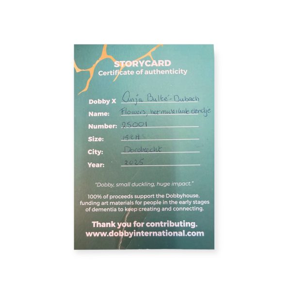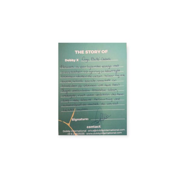 Flowers is een bijzonder eendje met pianotoetsen op zijn rug en kleurrijke bloemen tussen de veren. Waar hij ook zwom, klonk zachte muziek en bloeiden de bloemen om hem heen. Zijn melodieën brachten kleur, vreugde, rust aan iedereen die hem zag – een kleine herinnering dat schoonheid en muziek de wereld lichter maken.