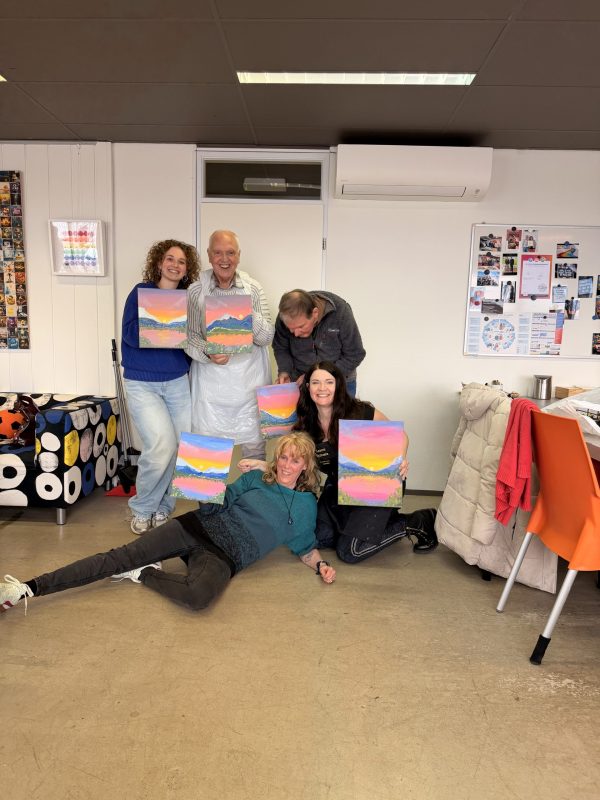 Langzaam verschijnen de eerste streken op het doek. De aandacht verschuift naar de kleuren en het mengen van verf. Gesprekken worden rustiger. Soms wordt er gelachen. Soms is het gewoon even stil terwijl iedereen geconcentreerd bezig is.